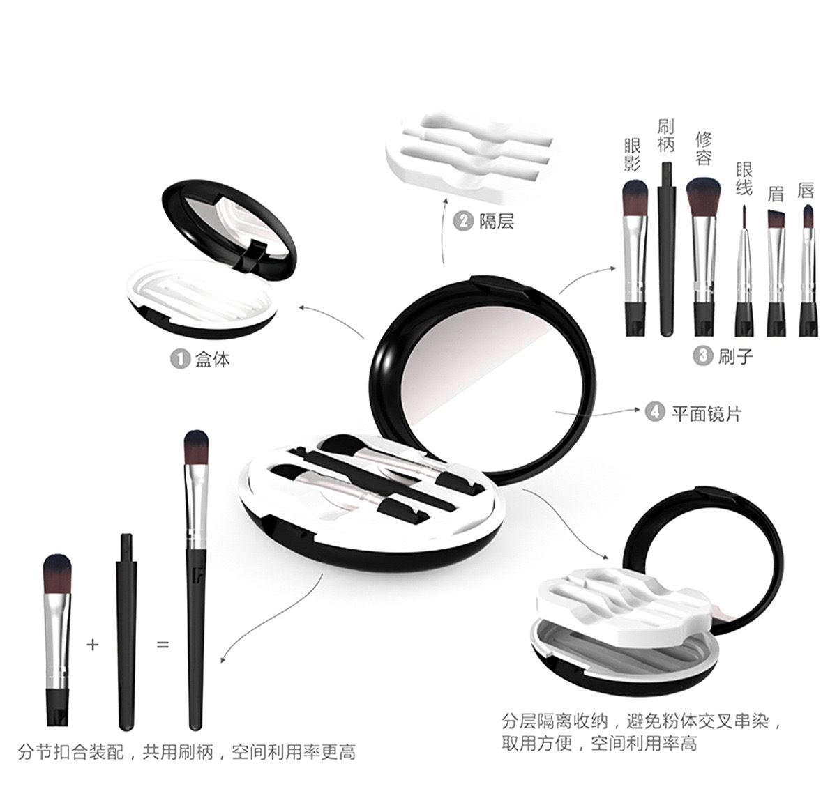 طراحی هوشمندانه: همه براشها با یک دسته مشترک قابل استفاده هستند که فضای کمتری اشغال میکند و نظم بیشتری به کیف آرایش شما میبخشد.